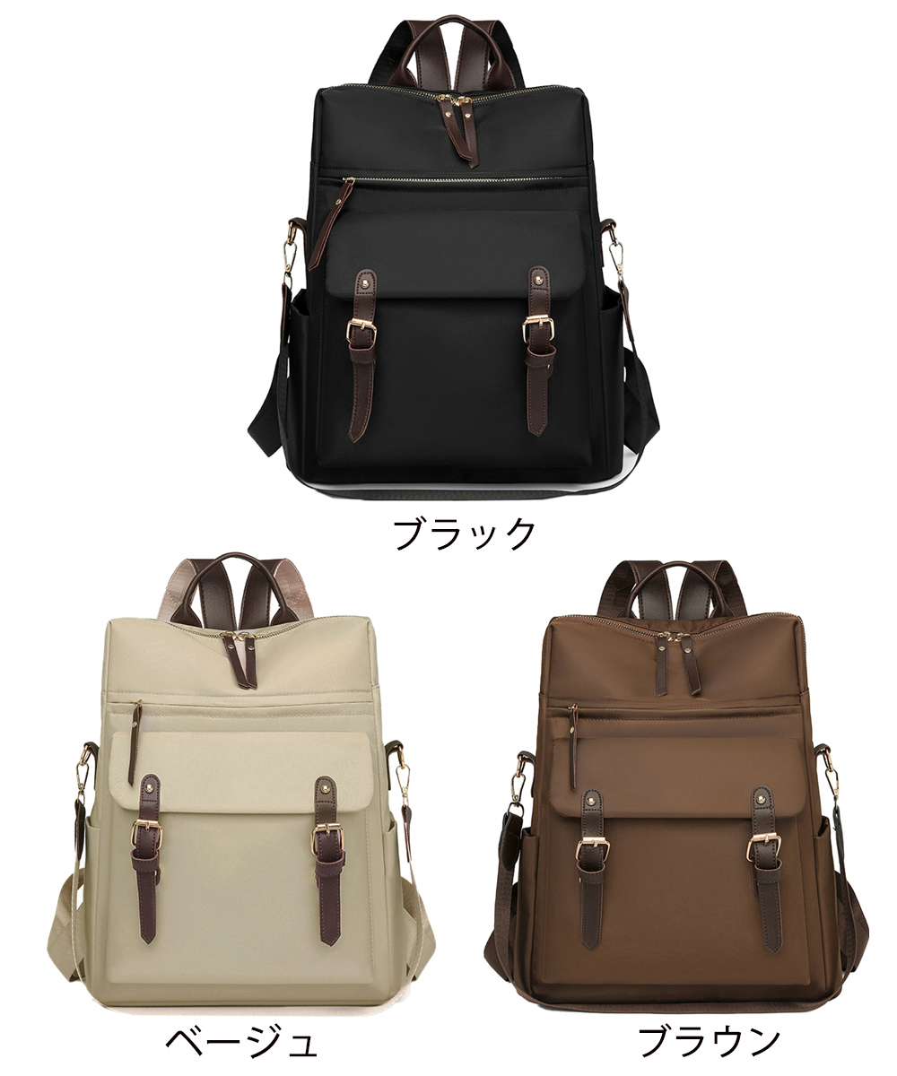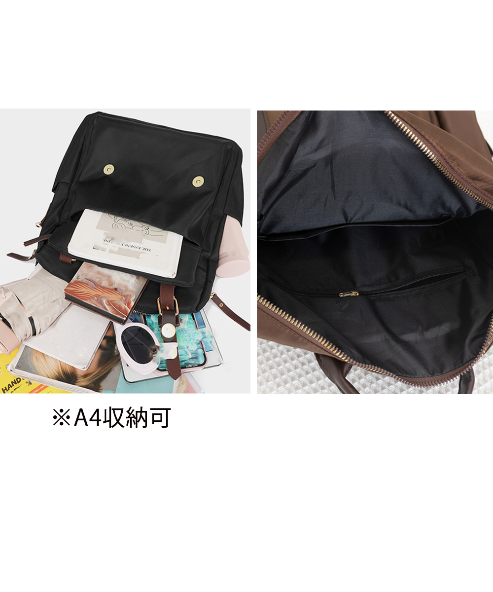高さ約36cm、軽量約445gでA4サイズ対応の大容量。合成皮革とナイロン素材で耐久性も抜群。ブラック・ベージュ・ブラウンの3色展開。