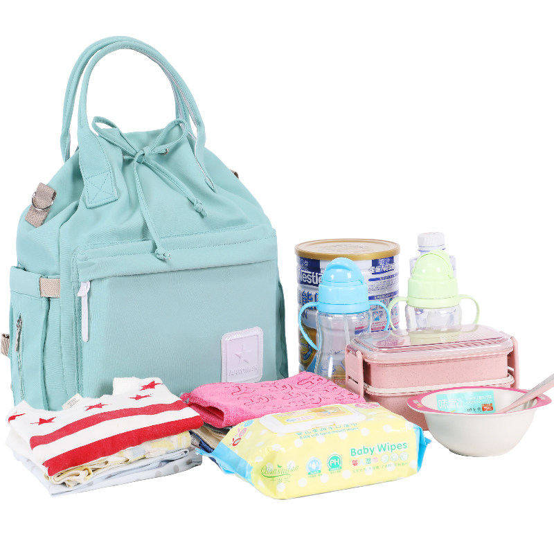 巾着型の開口部で荷物の出し入れがしやすく、哺乳瓶やおむつ、着替えなど赤ちゃんグッズをたっぷり収納できます。